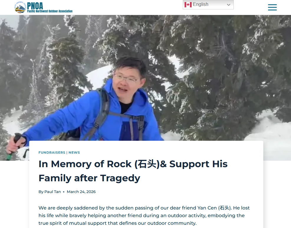 加拿大星星生活捷克佳/一名登山者在卑诗省山区坠落后身受重伤,不幸去世。网上筹款活动显示,该登山者是一名来自中国的游客。 太平洋西北户外协会(PNOA)表示,一名成员在温哥华都会区最高的山峰之一上试图营救同伴时不幸身亡,该成员是一名来自中国的游客,他的家人现在面临着“巨额”医疗费用。 PNOA在一份在…