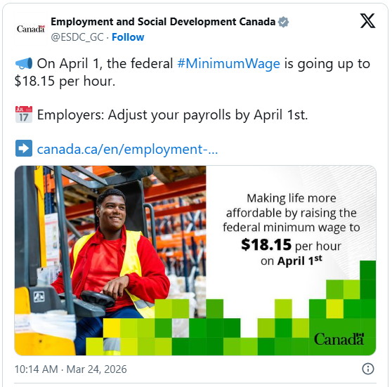 加拿大星星生活捷克佳/加拿大联邦最低工资即将再次上调。 加拿大就业和社会发展部(ESDC)于周二宣布,从2026年4月1日起,联邦最低工资将由目前的每小时17.75加元上调至18.15加元,涨幅为40分。 **与通胀挂钩:5年累计涨幅达21% 联邦最低工资每年根据通货膨胀进行调整,依据的是上一年度的…