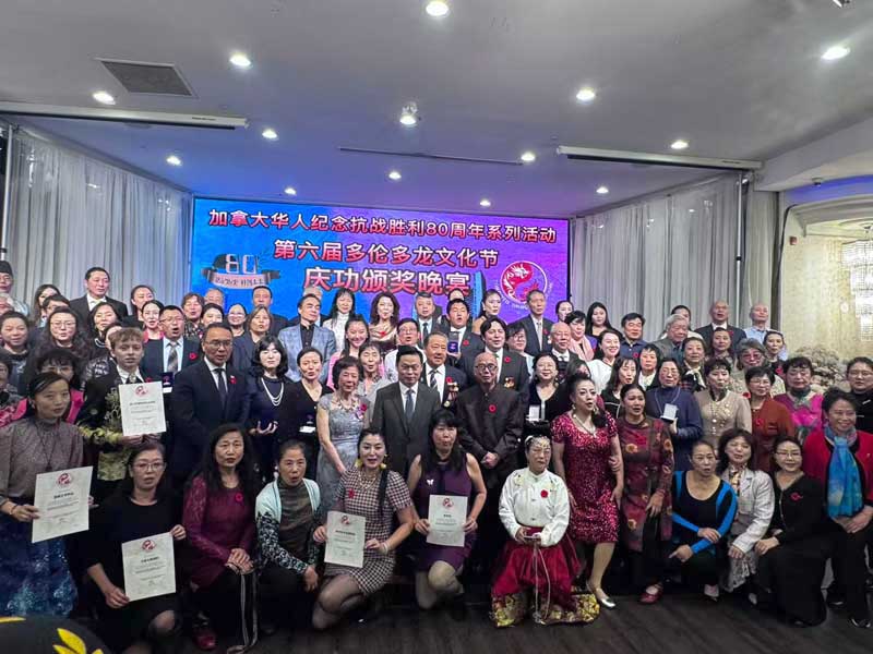 加拿大星星生活捷克佳/2025年11月5日晚,由第六届多伦多龙文化节暨纪念世界反法西斯战争和中国人民抗日战争胜利80周年系列活动组委会主办的庆功及颁奖晚宴,在多伦多豪门宴大酒楼隆重举行。来自社会各界的300余位嘉宾齐聚一堂,共同见证这一意义深远的时刻。 出席晚宴的主要嘉宾包括:中国驻多伦多代总领事程…