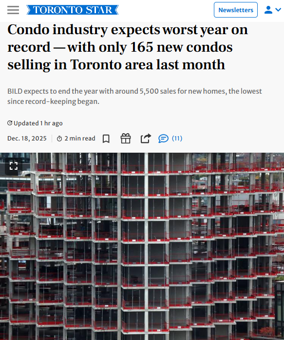 加拿大星星生活捷克佳/多伦多及大多区(GTA)的新建公寓市场正经历前所未有的寒冬。行业组织预计,2025年将成为有记录以来表现最差的一年,而新公寓销售的低迷态势,很可能持续到2026年。 根据Altus Group代表建筑业与土地发展协会(BILD)发布的最新月度报告,2025年11月,整个大多区仅…