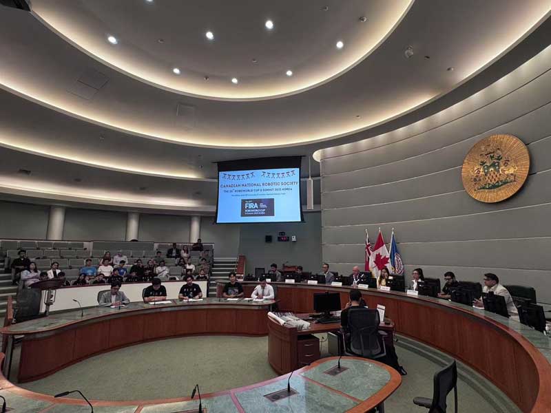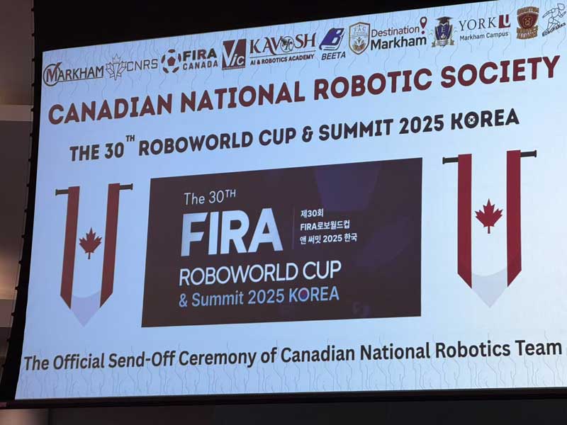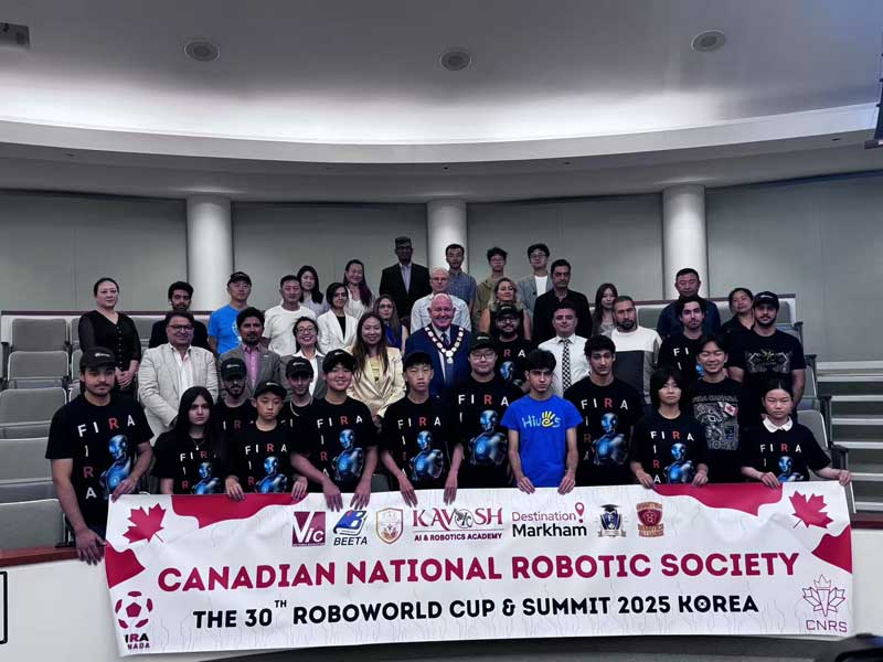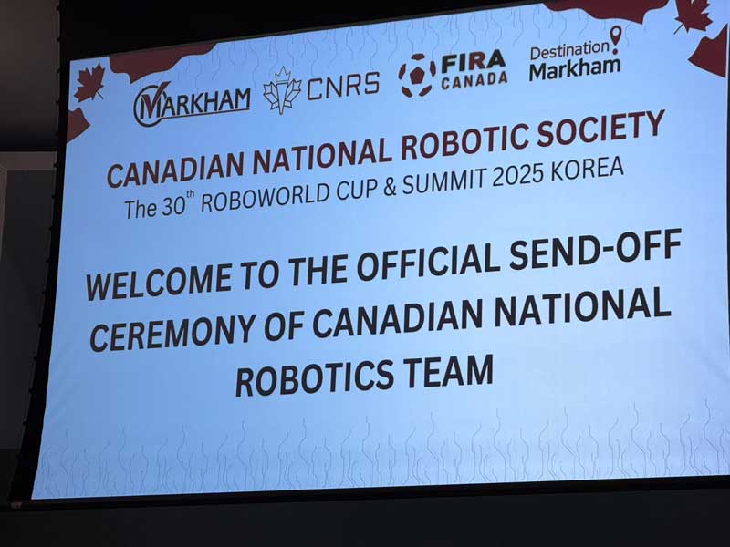 2025年8月6日,加拿大国家机器人协会(CNRS)在万锦市政中心议会厅隆重举办官方送行仪式,欢送即将代表加拿大参加第30届FIRA机器人世界杯的优秀学生代表。他们将于8月10日至15日前往韩国,角逐全球机器人界最具声望的赛事之一。