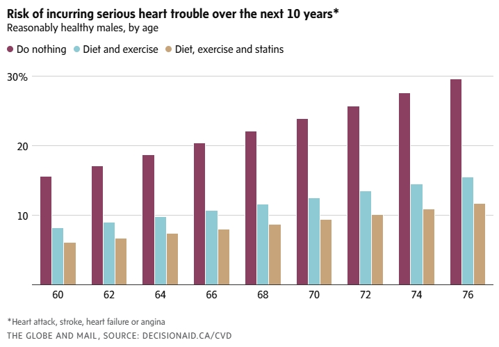 根据加拿大医生推荐的心血管疾病风险计算器(可在 decisionaid.ca/cvd 免费使用),年龄越大,10年内患上心脏病的风险自然越高。不过,更令人振奋的是,这一风险通过科学干预可以大幅降低。