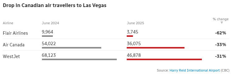 据拉斯维加斯会议与游客管理局数据,今年游客总数同比下降逾 11%,创下疫情之外的最大跌幅之一。航空数据显示,加拿大赴拉斯维加斯人数大幅减少:加拿大航空 6 月客运量同比下降 33%,作为哈里·里德国际机场最大加拿大承运人的西捷航空下降 31%,廉价航空 Flair 更是暴跌 62%。