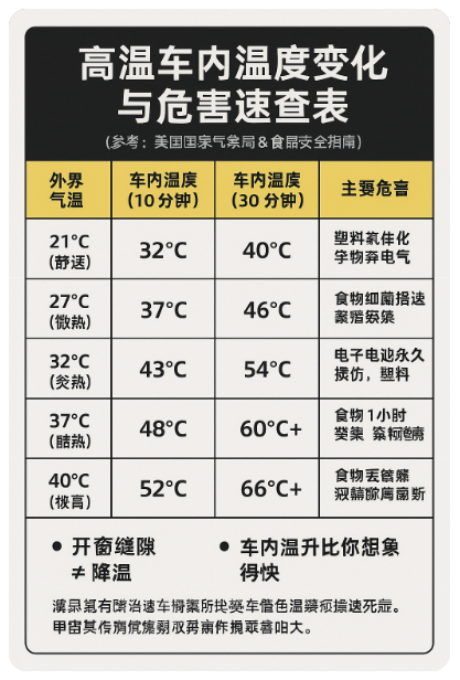车内温度变化比你想象得更快、更极端——几十分钟足以让塑料释放有害物质,让电子元件寿命骤减,让药物和食品失效。