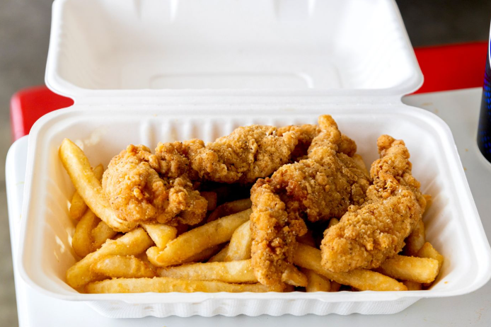 这是一份典型的“大份量”套餐:裹粉炸鸡柳搭配堆积如山的金黄薯条。