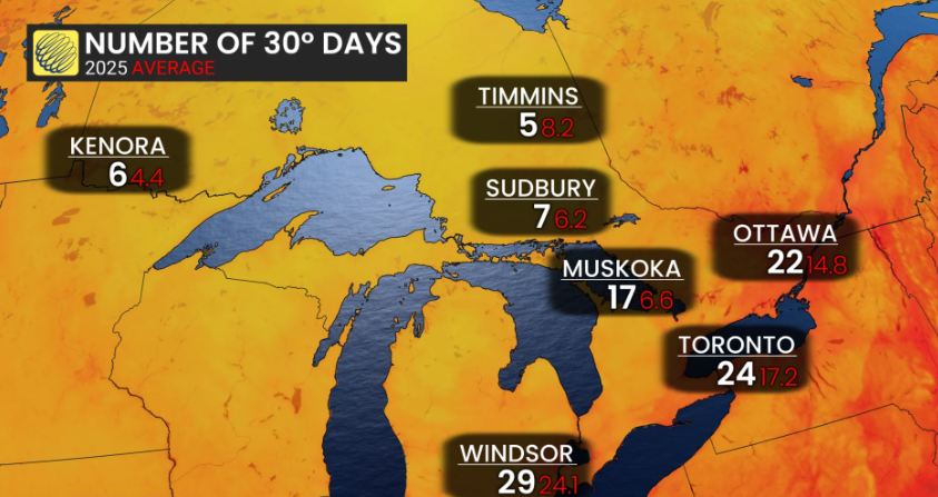 天气网络报道称,这个夏天,安省的高温表现并不逊色。多伦多已有24天达到或超过30℃,渥太华为22天,温莎更是达到29天,远超常年水平。