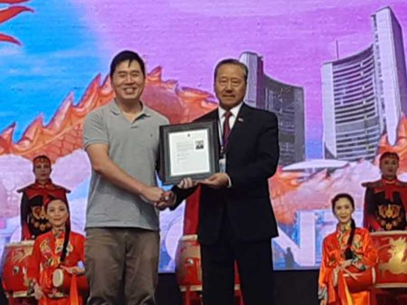 加拿大联邦国会议员陈圣源代表总理马克·卡尼(Mark Carney)宣读并向多伦多龙文化节主席、总策划、加华艺联主席张俭先生递交贺信,祝贺龙文化节圆满举办。