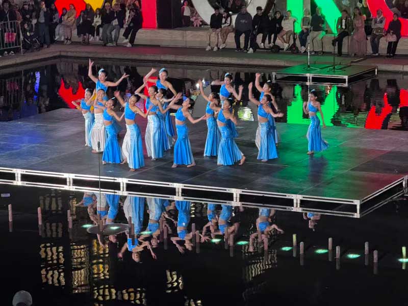 舞台分布于主舞台、水舞台和广场区域,白天到夜晚不间断上演精彩节目。入夜之后,水舞台灯火辉映,波光荡漾,舞者轻盈的身姿仿佛与水中倒影共舞,宛若一幅流动的画卷。鼓点如雷,烟火缭绕,光影与舞姿交织成节庆的诗篇。