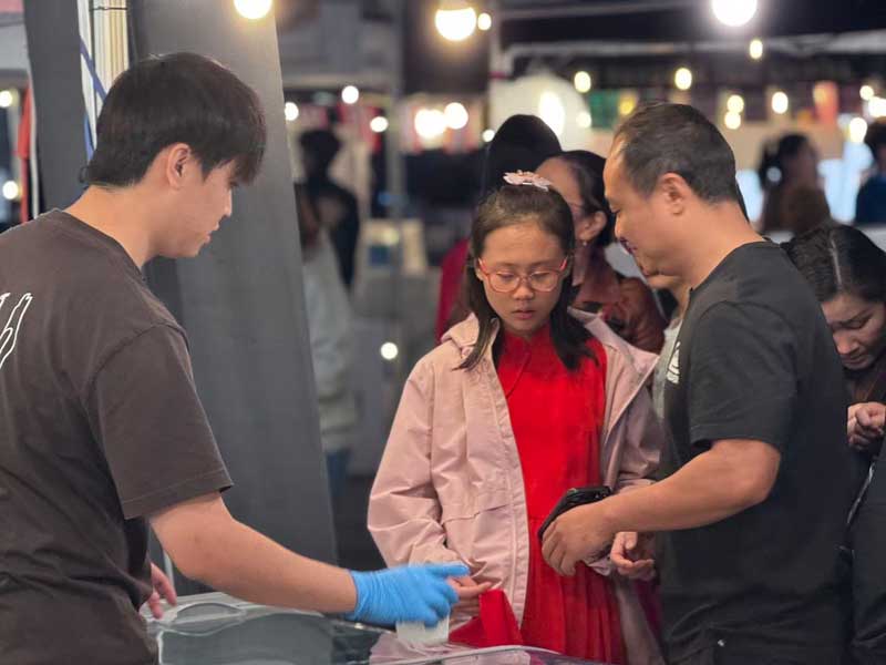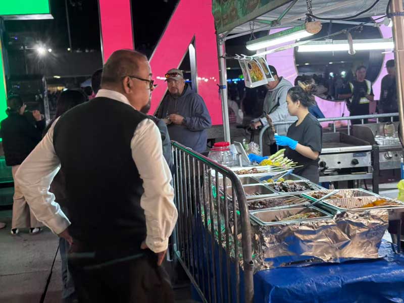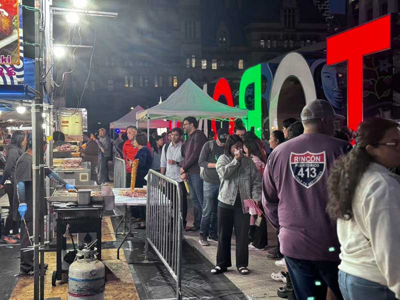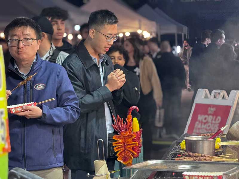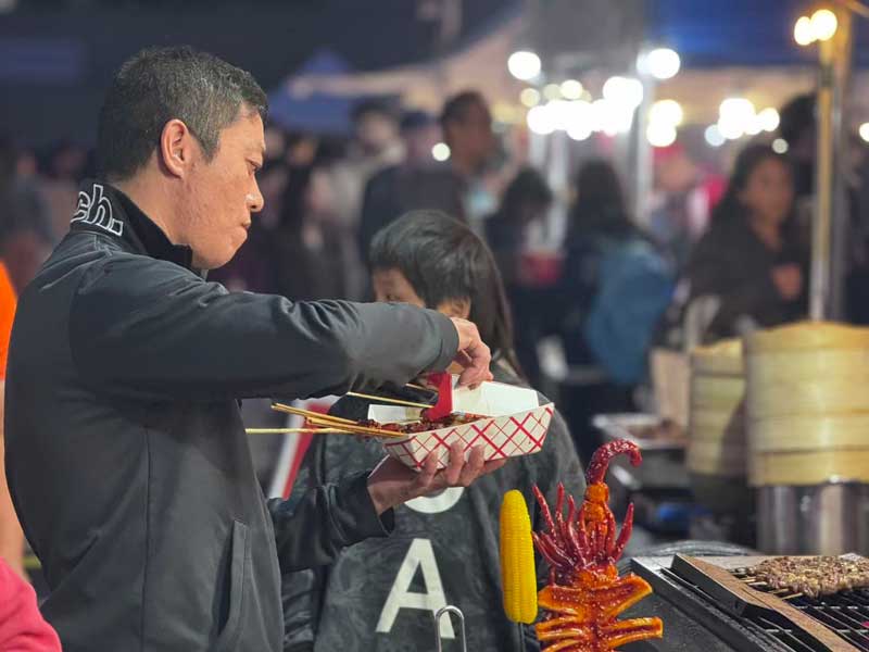广场上更有琳琅满目的美食摊位、工艺展示与文化体验区。人群中烟火闪烁,游客们边品尝糖葫芦、煎饼果子,边欣赏书法、国画、湘绣,整个市政厅广场宛如一座热闹的“中华文化小城”。