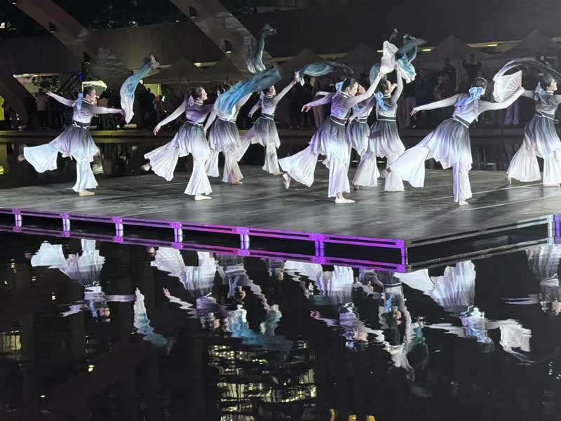 不同舞蹈团体将民族舞与现代舞交织融合,舞姿灵动飘逸。夜幕下,舞者在水上舞台翩然起舞,衣袂翻飞,倒影随波摇曳。灯光与舞影交织,水面泛起粼粼波光,仿佛一幅流动的画卷,为节日增添了诗意与华彩。