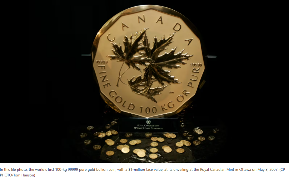 【资料照片:2007年5月3日,世界上第一枚100公斤99999纯金金币在渥太华加拿大皇家铸币厂揭幕,面值为100万元。(CP PHOTO/Tom Hanson)】