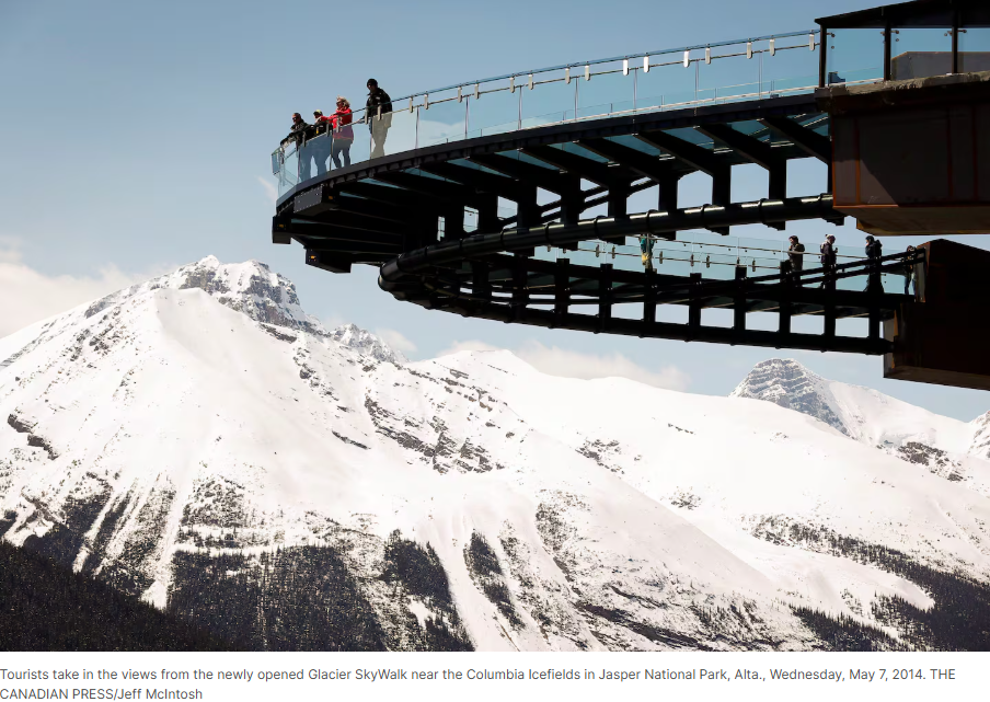 【游客们在加拿大阿尔伯塔省贾斯珀国家公园哥伦比亚冰原附近新开放的冰川天空步道上欣赏美景。CANADIAN PRESS/Jeff McIntosh】