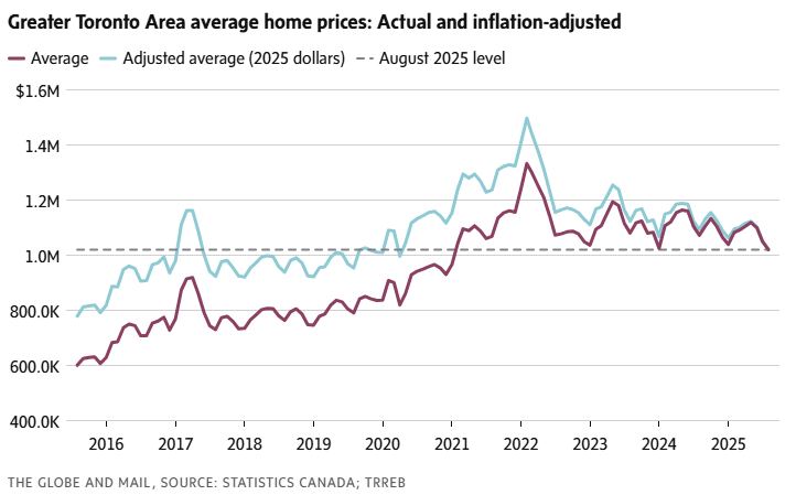 多伦多地区房地产委员会(TRREB)的数据进一步印证了市场的下行。8月GTA平均房价已跌至2021年2月以来的最低点,比2022年2月的峰值低逾20%。若考虑通胀因素,价格水平甚至已回落至2017年初以下,相当于让市场倒退了7年。