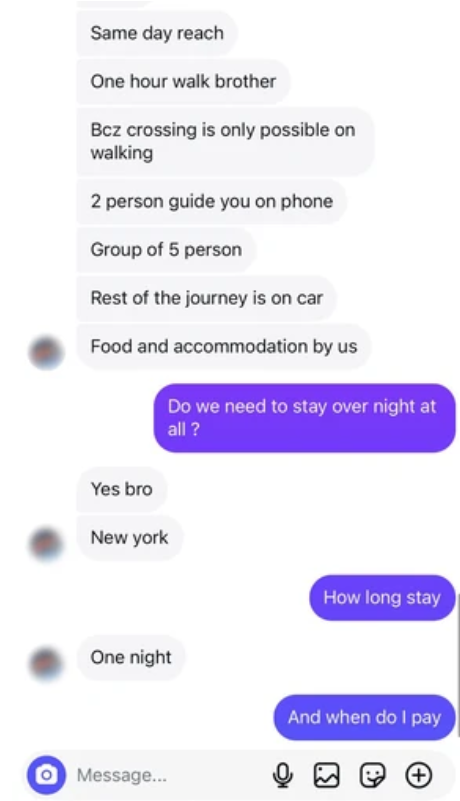 这只是数次接触之一。在另一场互动中,记者被指示从纽约州乘车北上,支付4,000元即可“安全过境”。在第三次接触里,记者则被要求在商场停车场上车,随后前往魁北克,步行一小时越境进入美国。