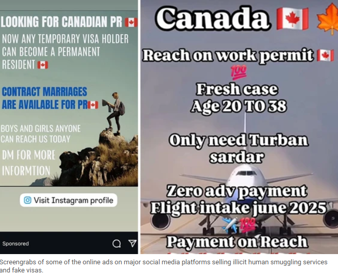 这些网络在社交媒体平台上公然兜售两类“服务”:一是带人穿越加美边境,每人收费约4,000元;二是出售伪造或非法获得的加拿大签证,街头价格最高可达40,000元。