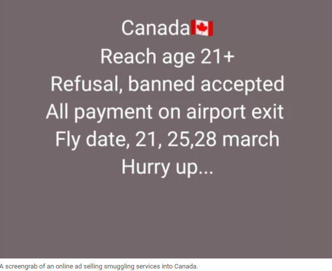 广告往往配有印度护照照片,上面盖满加拿大签证印章。一些卖家甚至声称“拒签或被禁止入境的人”同样可以通过他们的渠道入境。