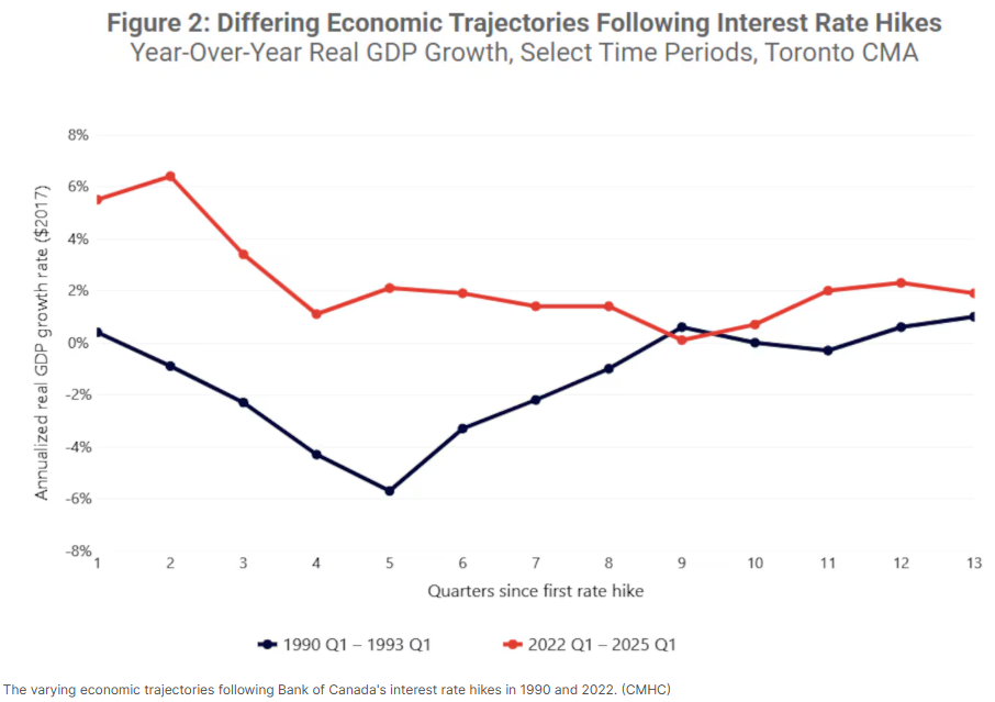 相较之下,尽管近两年利率上升令市场放缓,但多伦多整体经济保持相对稳定,CMHC仅预测未来可能出现“温和的经济衰退”,且对房地产市场的冲击有限。