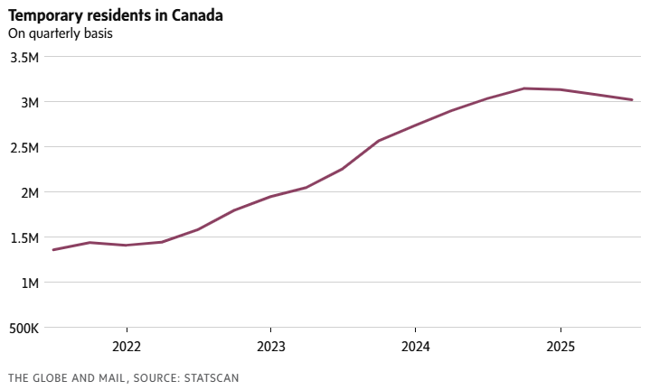2021年至2024年间,加拿大人口快速膨胀,四年间平均每季度增长21.5万人,主要受国际学生和临时外国工人推动。临时居民比例一度在2024年10月达到7.6%,超过300万人。