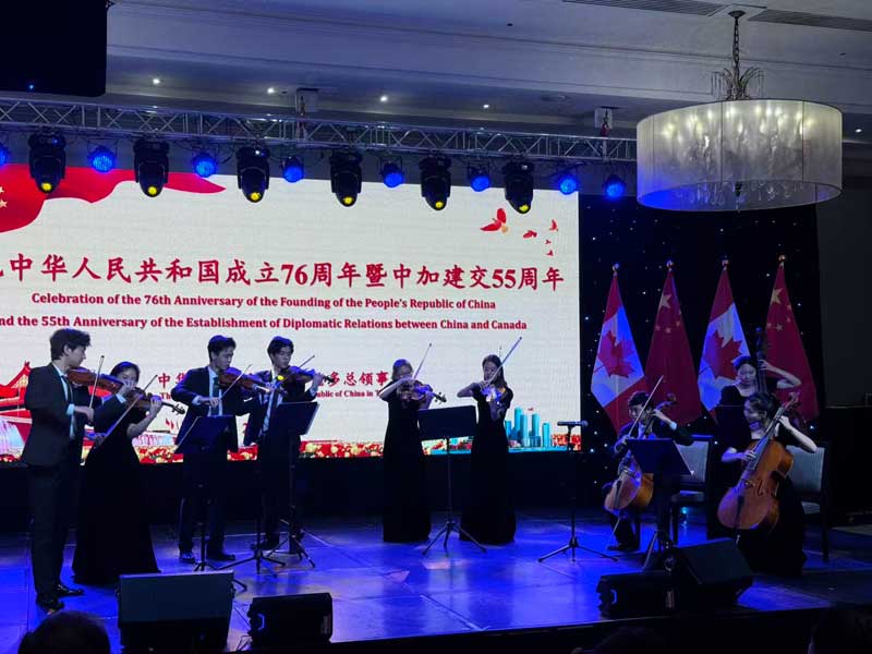 来宾们还共赏交响乐、舞蹈、民乐及茶艺、书法等文化展示,观看中加建交55周年主题图片展。
