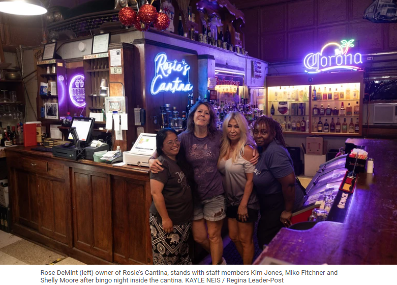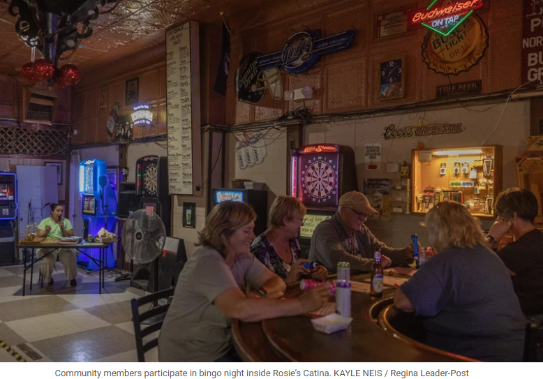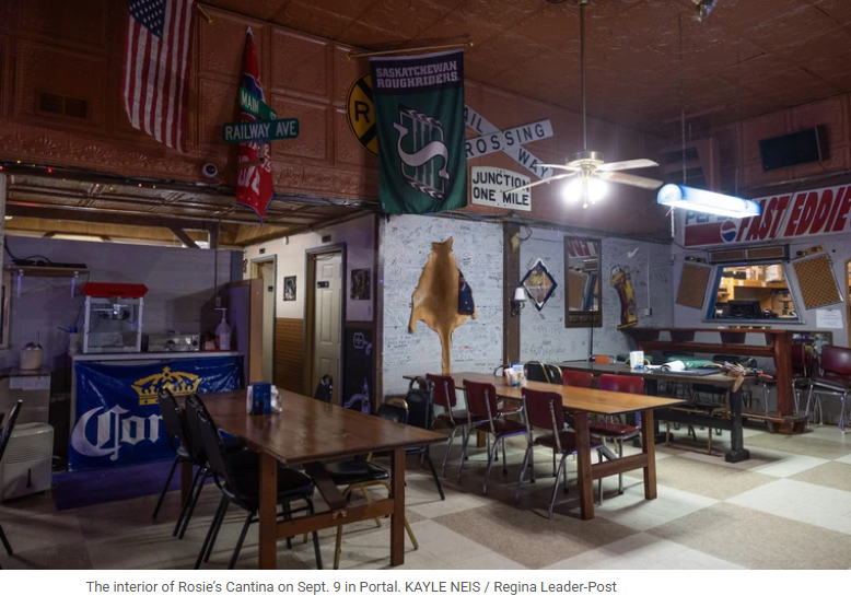 这是社区唯一一家兼具酒吧与餐厅功能的场所。酒吧内,一面美国国旗与萨斯喀彻温省骑兵队(Roughriders)的旗帜并排悬挂,象征着这个小镇两边的混合身份。