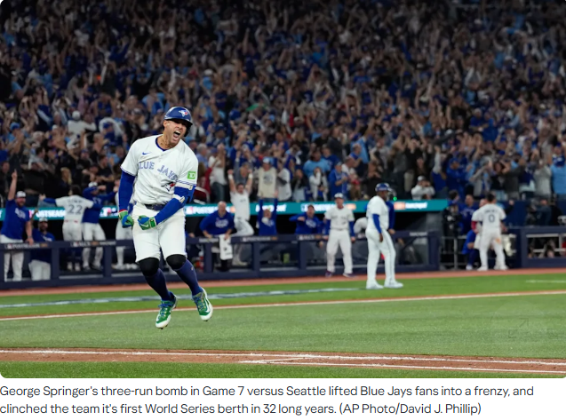 关键时刻,老将乔治·斯普林格(George Springer)在第七场击出三分本垒打,帮助蓝鸟锁定胜局。那一刻,罗杰斯中心球场沸腾,全加拿大也为之欢呼。