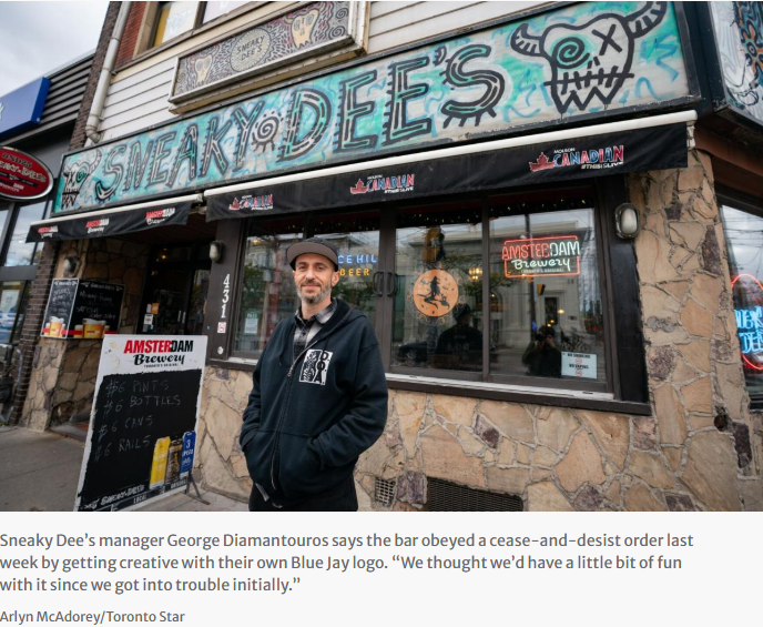上周,多伦多老牌酒吧 Sneaky Dee’s 收到蓝鸟队发出的“停止及终止通知”(cease-and-desist letter),原因是他们在社交媒体上使用了球队的商标来宣传观赛活动。