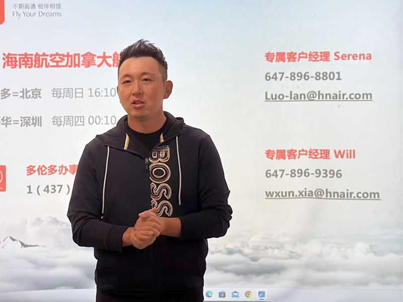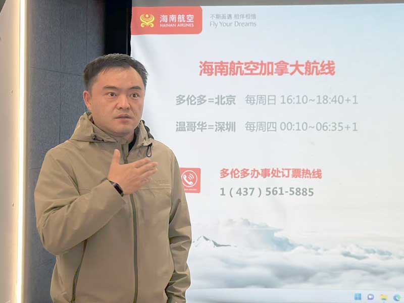 海航多伦多办事处总经理米博在致辞时回顾了海航自2010年进驻加拿大以来的历程——从首条中加直飞航线的开通,到疫情期间的坚持与复航后的重启,他说,海航始终深耕本地市场,致力于为旅客提供高品质服务。