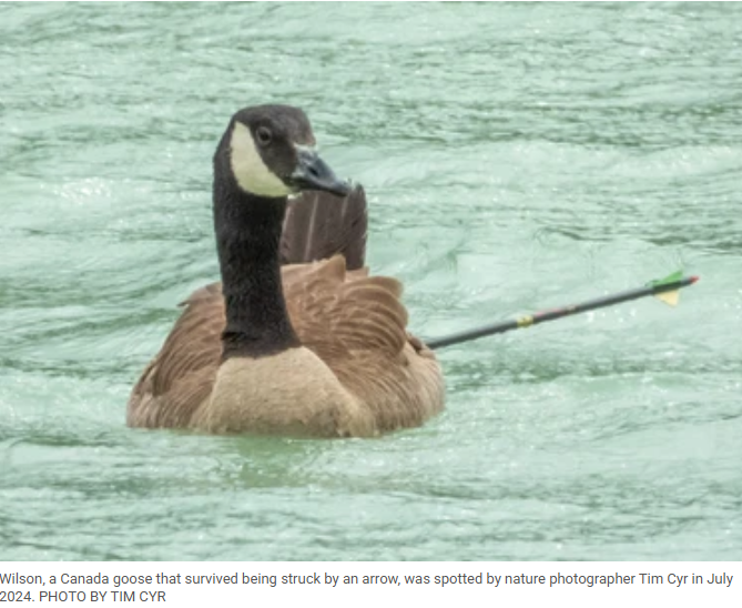 2024年,卑诗省的摄影师蒂姆·西尔(Tim Cyr)曾花七个月救助一只被箭射中的加拿大鹅——他给它取名“威尔逊”。那根箭贯穿了它的后背,却没要了命。志愿者最终捕获并治愈了它,让它重新飞回蓝天。