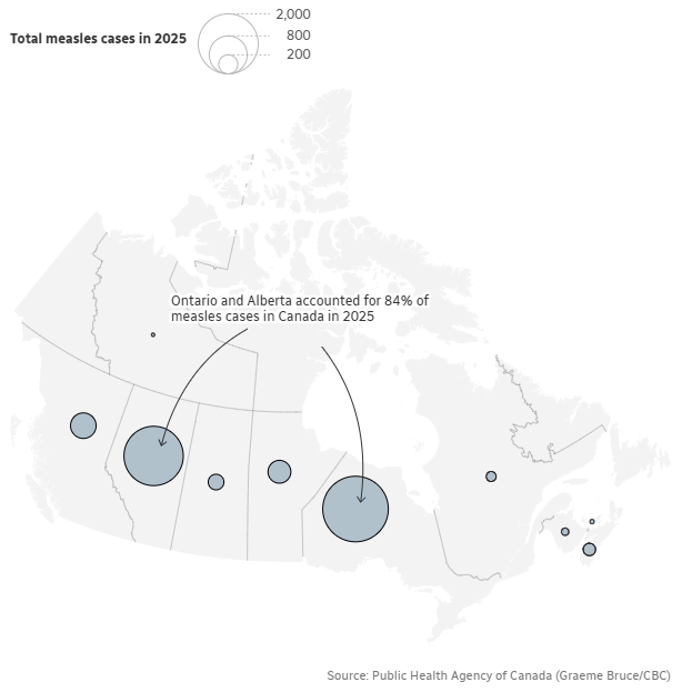加拿大自2024年秋季以来,已在九个省份和一个地区累计报告超过5,000例麻疹病例(其中4,777例确诊、361例疑似),包括阿尔伯塔省、不列颠哥伦比亚省、曼尼托巴省、安大略省和魁北克省等。