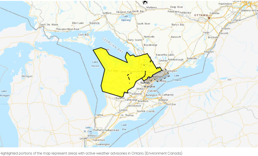 目前安大略省大片地区发布了暴雪警报,范围从东部的林赛(Lindsay)延伸到西部的格兰德本德(Grand Bend),北部延伸到托伯莫里(Tobermory)和马尼图林岛(Manitoulin Island)。