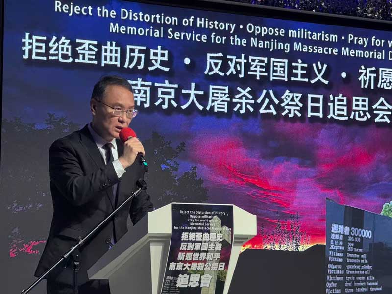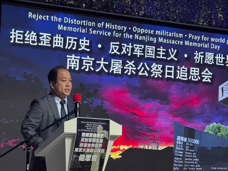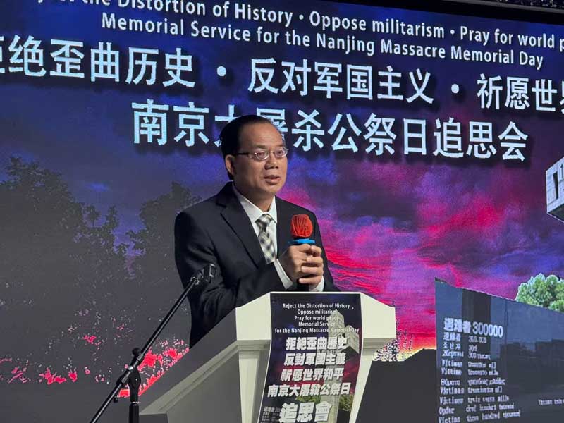 中国驻多伦多总领馆政新领侨处负责人张超峰领事在发言中表示,南京大屠杀是真实且被国际社会公认的历史事实,不能因时间流逝而被淡忘。他高度肯定安省与万锦市议会先后通过的南京大屠杀纪念日动议,以及大多伦多地区纪念碑的落成,称这是华社持续努力的成果。