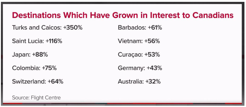 据Flight Centre的数据显示,特克斯和凯科斯群岛、圣卢西亚和日本是加拿大游客增长最快的旅游目的地。前往加拿大西部和东部的国内旅游也有所增长。