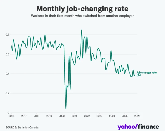 根据加拿大统计局的数据,2025年下半年,每月每1000名在职者中,只有约4人更换工作;而在疫情前,这一数字约为每1000人中有7人。这意味着,加拿大职场的“流动性”已显著放缓。