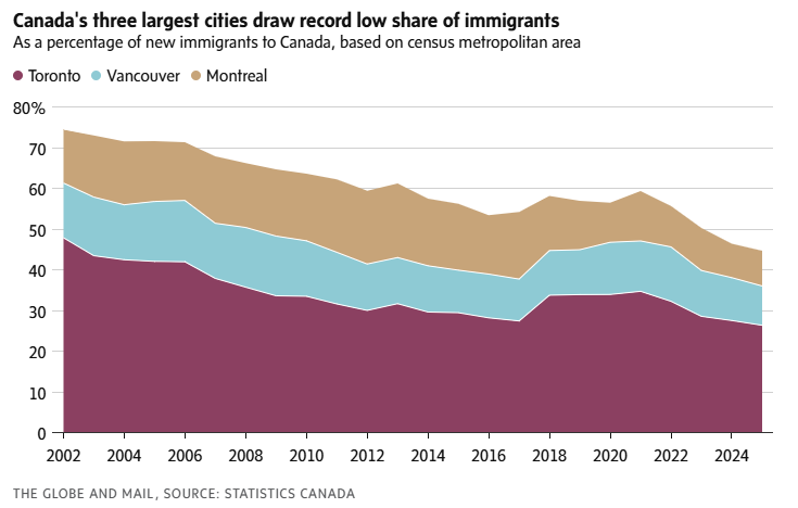 根据加拿大统计局发布的市级人口估计数据,在截至2025年年中的12个月里,多伦多、温哥华和蒙特利尔这三个人口普查大都会区共吸引了46%的新移民,低于20年前的近80%。
