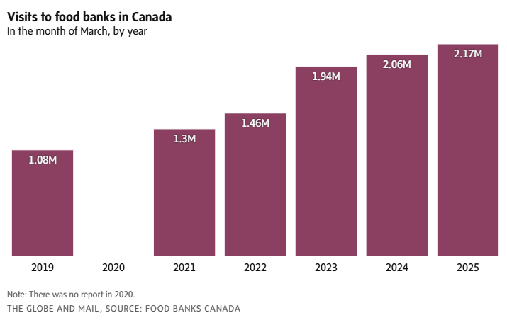 加拿大食品银行协会近几个月来一直警告称,使用食品银行的人数稳步上升,并表示去年的使用量是 2019 年的两倍。