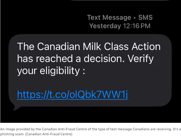 诈骗分子正是利用这些真实案件,让骗局看起来更加可信。他们向大量加拿大人发送短信,内容通常包括:加拿大牛奶集体诉讼已达成和解,请验证您的资格领取赔偿。