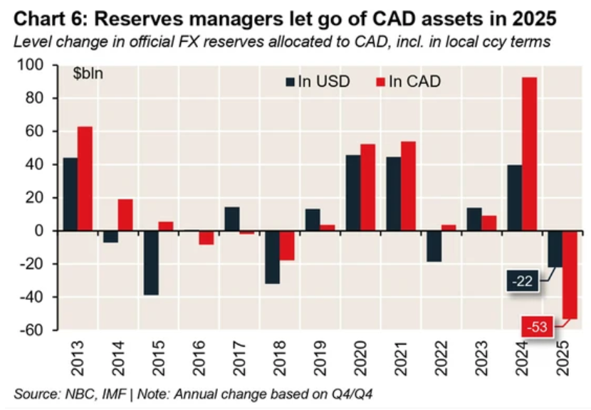 “在2025年最后一个季度,没有任何其他货币在全球外汇储备池中的份额降幅超过加元……甚至美元也未能幸免,”洛夫利说道。