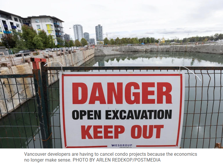 在温哥华,一些项目已经被取消,因为建造成本过高,买家需求下降,融资压力加大。