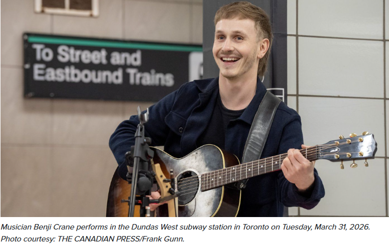 乘坐TTC的通勤者或许还会偶遇本吉·克莱恩(Benji Crane),他是一位会弹吉他和小提琴的歌手。周二下午,他在登打士西站表演时,看到乘客们来来往往,甚至有一位乘客停下来,和他一起合唱Bradley Cooper和Lady Gaga的歌曲《Shallow》,这让克莱恩露出了笑容。